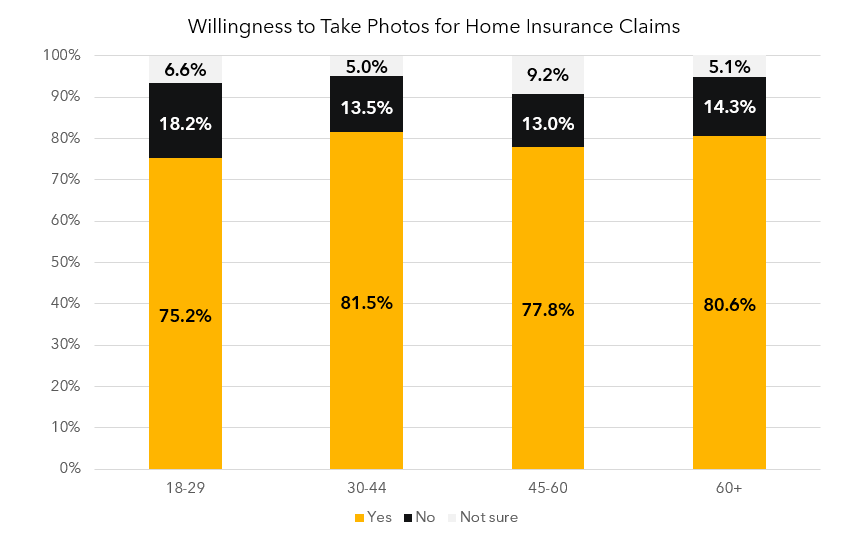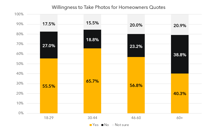 Older homeowners, often assumed to be more reluctant adopters of digital tools, show the highest willingness to use their smartphones for claims (more than 80% among those 60+). That suggests this isn’t just a generational trend—it’s a situational one. When the stakes are clear and the payoff is fast, people are ready to act.