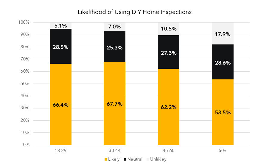 More than six in ten homeowners (62.5%) say they are very or somewhat likely to try smartphone inspections if their insurers offered it. Younger homeowners skew higher toward very likely, but even middle-aged and older groups show strong openness.