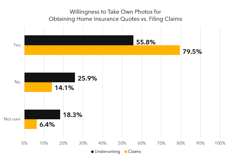 More than half of homeowners (55.8%) say they would take smartphone photos to obtain an insurance quote. That willingness jumps to nearly 80% when it comes to documenting property damage for a claim.